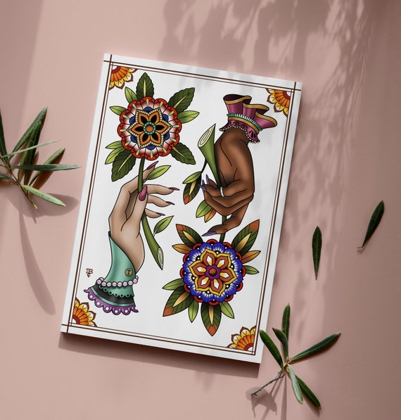 Traditional Hand And Flower Tattoo Style Prints A4 Etsy